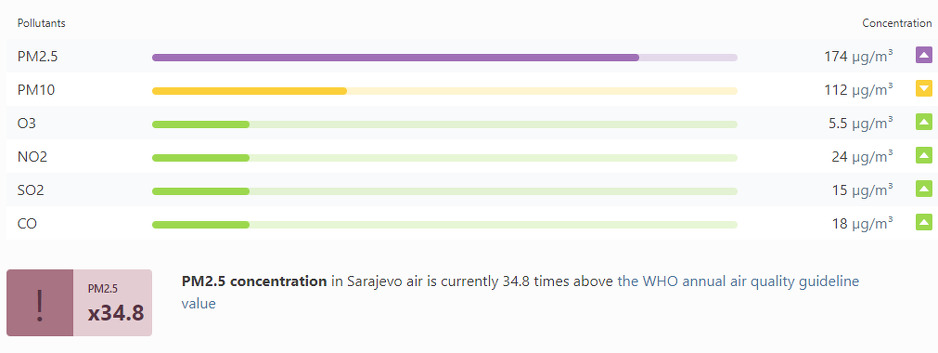 Prema podacima servisa AirVisual, vrijednost indeksa (ne)kvalitete zraka u glavnom gradu Bosne i Hercegovine iznosi 198. Sarajevo je trenutno drugi na listi najzagađenijih gradova na svijetu. Prvo mjesto je zauzeo Lahore (Pakistan).