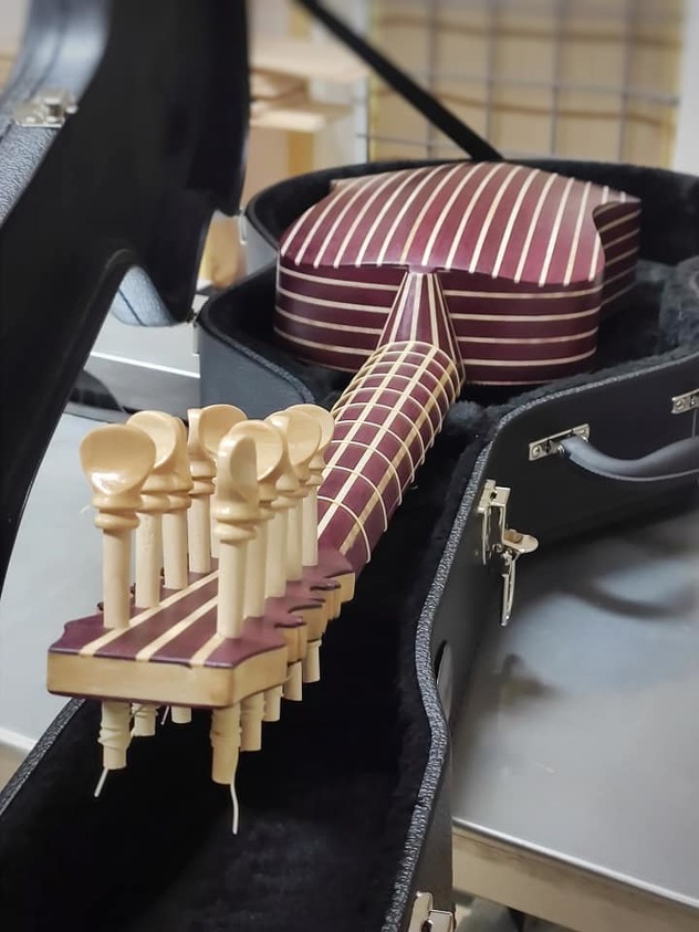 "Iako je svaki instrument priča za sebe, suštinski imaju dosta sličnosti. Prednja ploča rađena je od domaće smreke, dok se za izradu rebara iz inostranstva naručuju indijski palisander ili ružino drvo. Sve žice se ručno rade te se također naručuju iz inostranstva, najčešće iz Italije ili Njemačke. Čivije se proizvode isključivo od drveta, dok je ukrasna rozeta napravljena od originalnog pergamenta. Sam proces izrade iziskuje oko 150 radnih sati", dodaje Biser.