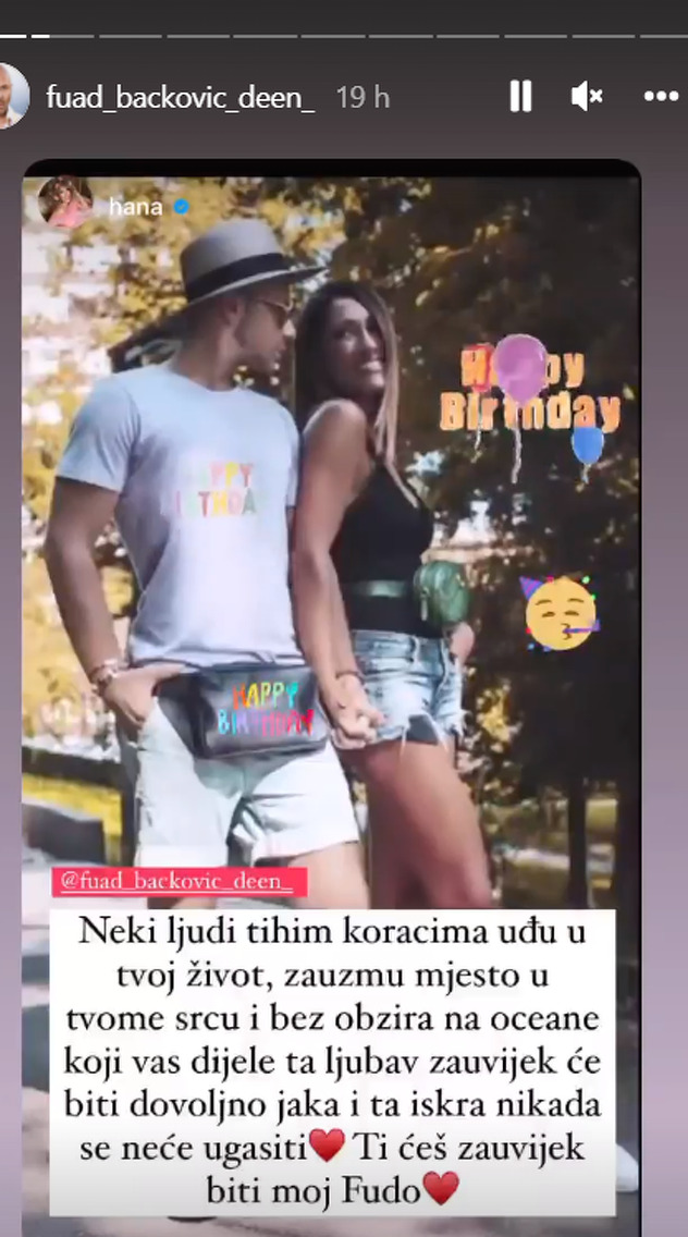 "Neki ljudi tihim koracima uđu u tvoj život, zauzmu mjesto u tvom srcu i bez obzira na oceane koji vas dijele ta ljubav će biti dovoljno jaka i ta iskra nikad se neće ugasiti. Ti ćeš zauvijek biti moj Fudo", napisala je Hana Hadžiavdagić u rođendanskoj čestitki uz zajedničku fotografiju s Deenom.
