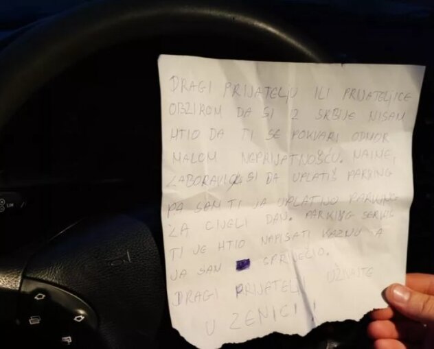 "Dragi prijatelju ili prijateljice. Obzirom da si iz Srbije, nisam htio da ti se pokvari odmor malom neprijatnošću. Naime, zaboravio/la si da uplatiš parking pa sam ti ja uplatio parking za cijeli dan. Parking servis ti je htio napisati kaznu a ja sam spriječio. Dragi prijatelji, uživajte u Zenici", piše na papiriću.
