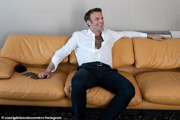 Na jednoj od fotografija Macron pozira u ležernom izdanju s raskopčanom košuljom, a u prvom planu su njegova dlakava prsa.
