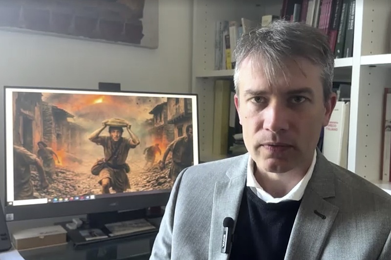Slika kreirana umjetnom inteligencijom, koju je u ponedjeljak objavio Arheološki park Pompeji, prikazuje čovjeka kako se saginje u zaklon dok drži veliku zdjelu iznad glave, s eruptiranim Vezuvom u pozadini.