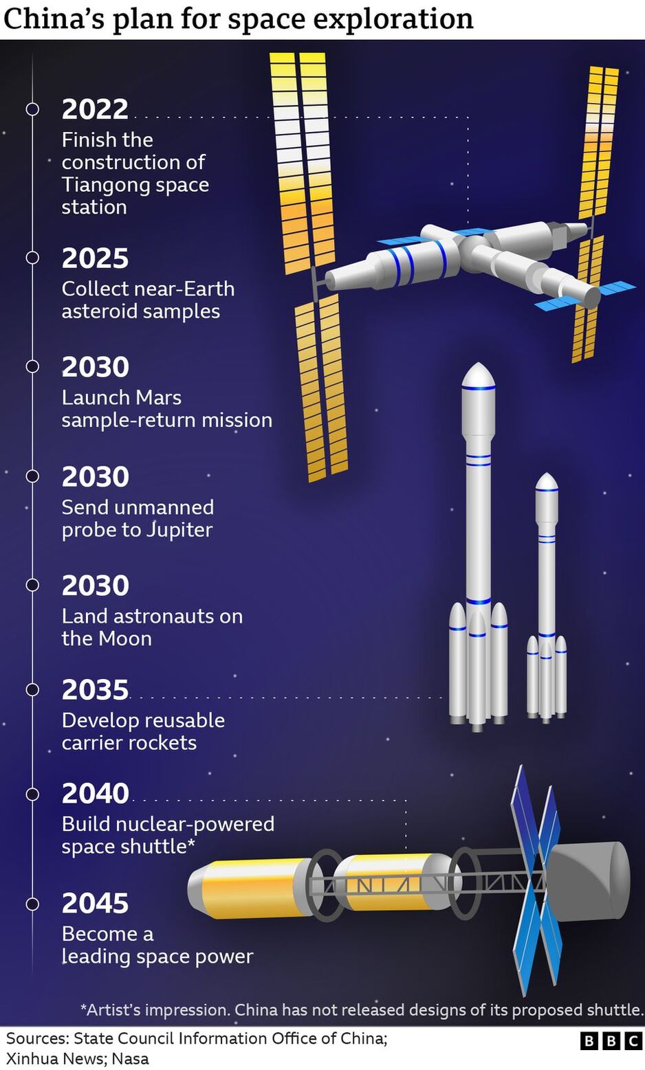 Prošle godine je Kina u orbitu poslala prvi modul svoje Tiangong svemirske stanice, a planira dodati i nove module poput naučnog laboratorija Mangtian do kraja godine. Sljedeće godine će lansirati svemirski teleskop pod nazivom Xuntian, koji će biti blizu svemirske stanice te će se spajati s njom zbog servisiranja i punjenja gorivom.