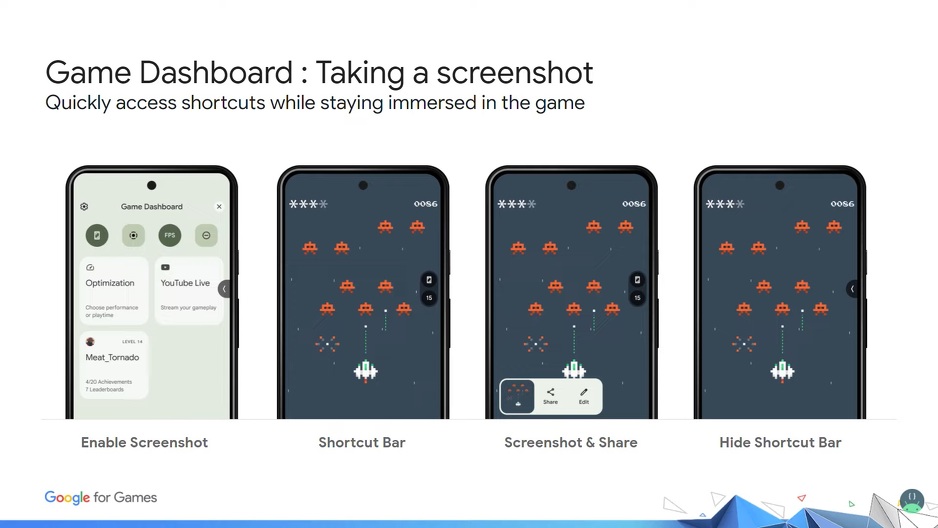 Informacije su potvrđene tokom samita Google for Games Developer Summit 2021. Google je otrio da će novi game dashboard na Androidu 12 omogućiti lakši pristup funkcijama poput screenshota i snimanja. Ovaj dashboard će biti dostupan na "odabranim uređajima" nešto kasnije ove godine.