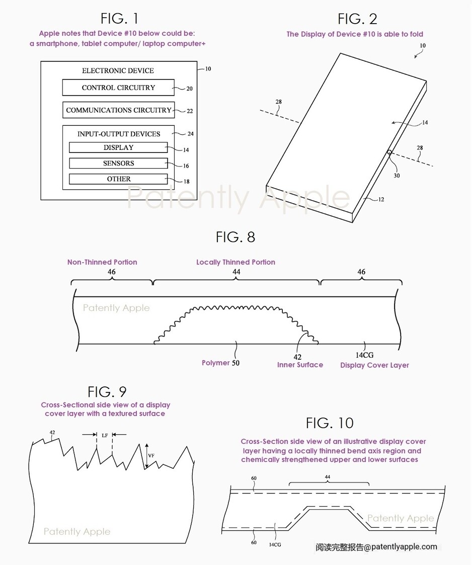 Appleov patent pokazuje da se nabori na ekranu mogu spriječiti providnim pokrovnim slojem, koji prelazi preko panela ekrana. Izduženi žlijeb ili udubljenje mogu se formirati u sloju stakla koji ide paralelno s osom savijanja, dok preklapa osu savijanja.