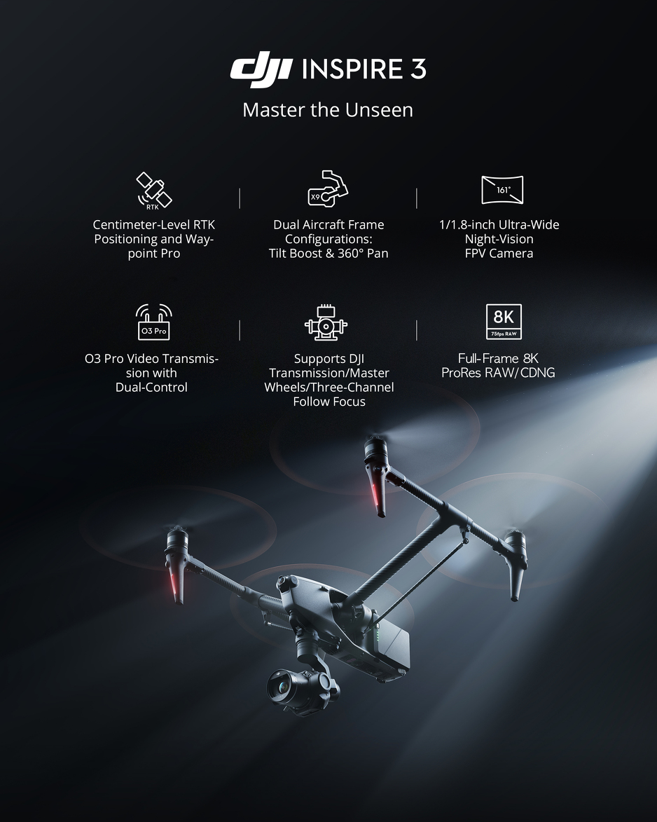 DJI Inspire 3 je opremljen Zenmuse X9-8K Air Gimbal Camera kamerom s širokim rasponom dinamičkih boja i kompatibilna je s različitim sočivima. Njegov sistem kamera ima dvostruki ISO za jasne snimke i pri slabom osvjetljenju te pokriva više od 14 koraka dinamičkog raspona kako bi se lakše "uhvatilo" svjetlo i sjene tokom izlaska i zalaska sunca. Također, posjeduje Tilt Boost i Pan strukture od 360 stepeni.