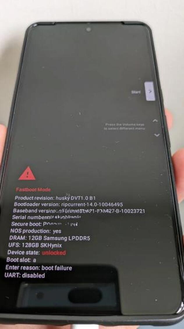 Na drugoj naljepnici je ispisano "Zuma -B1", što je moguće kodno ime Googleovog nadolazećeg procesora Tensor G3. Ekran prikazuje Fastboot Mode koji otkriva da uređaj ima 12 GB Samsungovog LPDDR5 DRAM-a i 128 GB interne memorije.