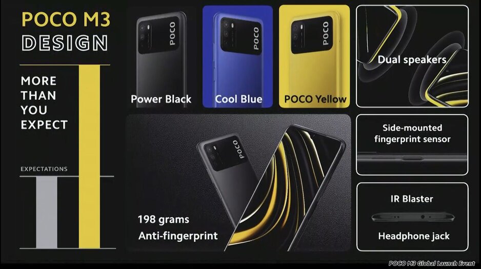 Poco M3 napaja impresivna baterija od 6.000 mAh, njegova debljina iznosi 9,6 mm, a težak je 198 grama. Dostupan je u verzijama sa 64 i 128 GB interne memorije, ima dva slota za SIM Kartice i odvojeni microSD slot, a posjeduje i utor za slušalice i USB-C port.