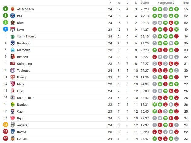 Nica je ostala trećeplasirana ekipa Ligue 1 sa tri boda zaostatka u odnosu na Monaco, dok je St. Etienne na petom mjestu.