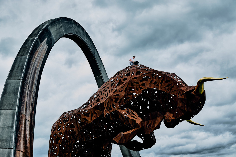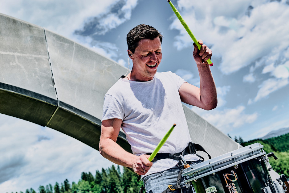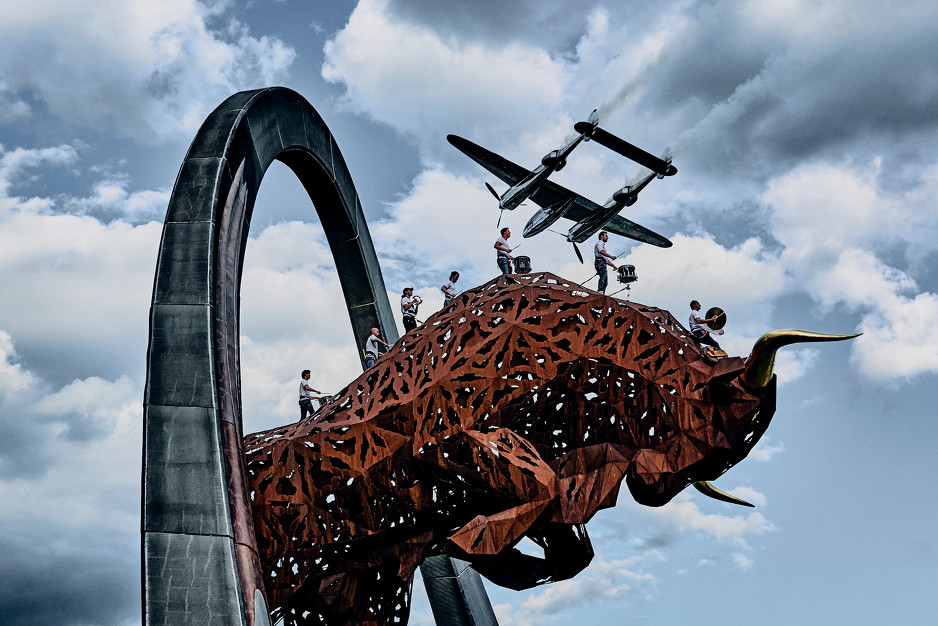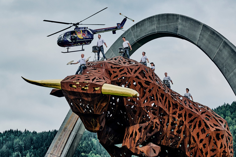 Grubinger je okupio muzičare različitih pravaca i zbor od 150 ljudi kako bi svoju viziju pretvorio u stvarnost. U središtu muzičke instalacije nazvane "Drum the Bull“ bio je čelični bik Spielberg, kojeg su Grubinger i njegovi kolege perkusionisti oživjeli pomoću četkica, metalnih i drvenih bubnjeva, pa čak i čekića.