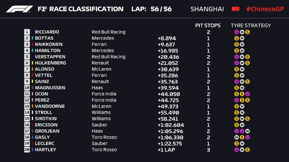 Ricciardo je fantastično vozio utrku u Kini i na kraju slavio ispred Valtterija Bottasa i Kimija Raikkonena koji su zauzeli drugo, odnosno treće mjesto.
