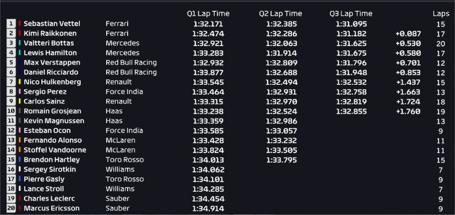 Razlika između Vettela i Raikkonena iznosila je samo 87 hiljaditih dijelova sekunde, a ovo je za Vettela čak 52. put da osvoji pol poziciju u karijeri.