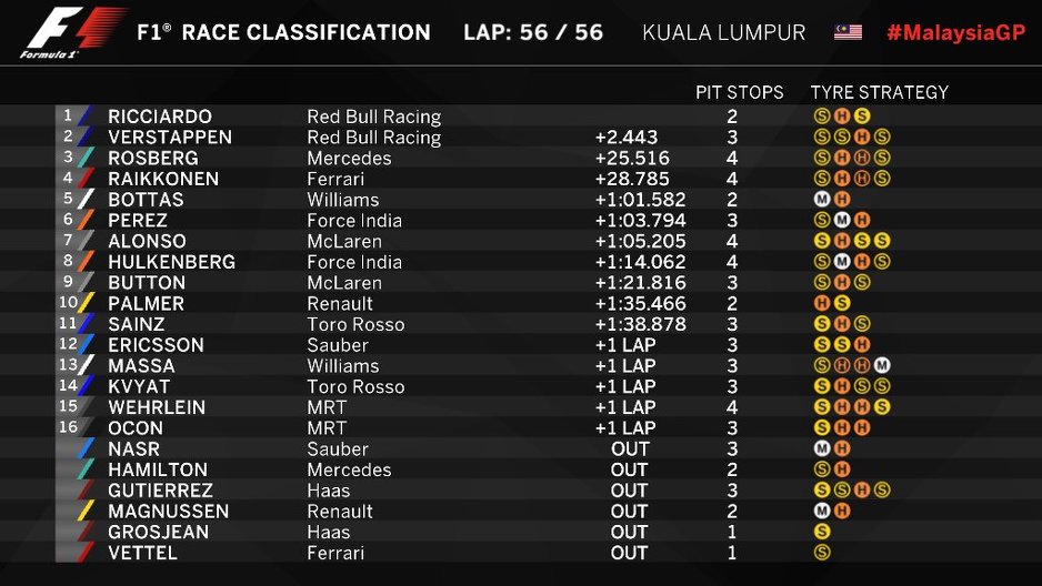 Prvo mjesto u Maleziji osvojio je Ricciardo, a drugi je bio njegov kolega Max Verstappen sa 2,4 sekunde zaostatka. Rosberg je zaostajao 25,5 sekundi.
