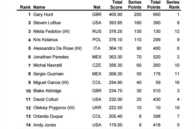 U generalnom poretku muškaraca nakon Hunta (660 bodova), drugi je Jonathan Paredes (560 bodova) iz Meksika koji je u Mostaru bio peti, dok je treći u generalnom poretku Blake Aldridge (510 bodova) koji se u Mostaru nije uspio plasirati ni u finale, odnosno među osam najboljih takmičara, jer je bio 10. nakon tri serije.