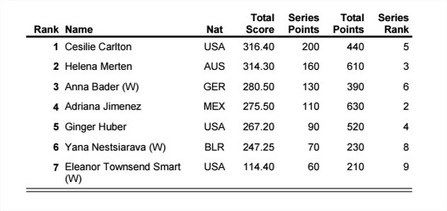 Prva u ženskoj konkurenciji bila je Cesilie Carlton iz SAD-a, druga je bila Helena Merten iz Australije, a treće mjesto je zauzela Anna Bader iz Njemačke koja je također stigla uz "wild card".
