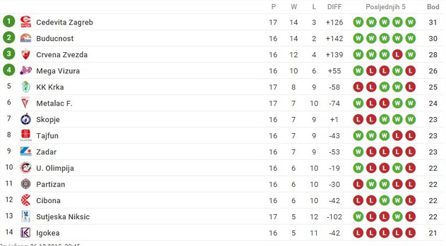 Cedevita je pobjedom nad Krkom u 17. kolu ABA lige zauzela prvo mjesto na tabeli. Zagrebački tim je na svom parketu slavio rezultatom 70:60.