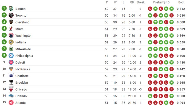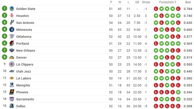 Detroit Pistonsi - Memphis Grizzlies 104:102 Washington Wizards - Toronto Raptors 122:119 Minnesota Timberwolves - Milwaukee Bucks 108:89 San Antonio Spurs - Houston Rockets 91:102 Denver Nuggets - Oklahoma City Thunder 127:124