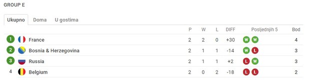 19:40 - Naša reprezentacija trenutno se nalazi na drugom mjestu grupe E s tri osvojena boda, a u dosadašnje dvije utakmice upisali smo pobjedu protiv Rusije i poraz od Francuske. S druge strane, Belgija je poražena i od Francuske i od Rusije.