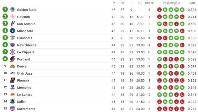 Tabela Zapadne konferencije: