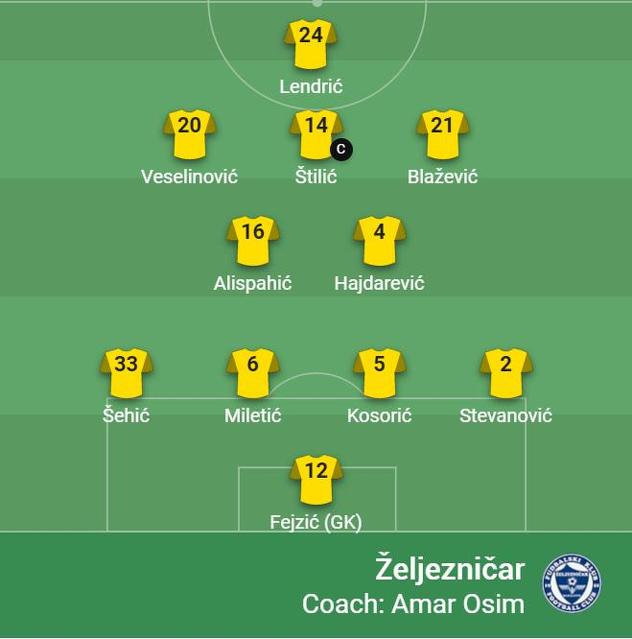 Željezničar će zaigrati u sastavu: Fejzić - Stevanović, Miletić, Kosorić, Šehić - Hajdarević, Alispahić - Veselinović, Štilić, Blažević - Lendrić.