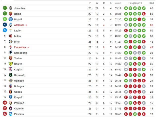 Atalanta i Fiorentina podijelili su bodove u okviru 27. kola Serije A odigravši neriješeno 0:0.