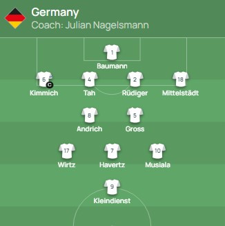 Njemačka: Oliver Baumann, Maximilian Mittelstadt, Antonio Rudiger, Jonathan Tah, Joshua Kimmich, Pascal Gross, Robert Andrich, Florian Wirtz, Jamal Musiala, Kai Havertz i Tim Kleindienst.