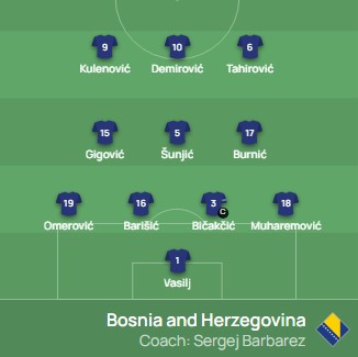 BiH: Nikola Vasilj, Nail Omerović, Adrian Leon Barišić, Ermin Bičakčić, Tarik Muharemović, Ivan Šunjić, Dženis Burnić, Armin Gigović, Benjamin Tahirović, Ermedin Demirović i Luka Kulenović.
