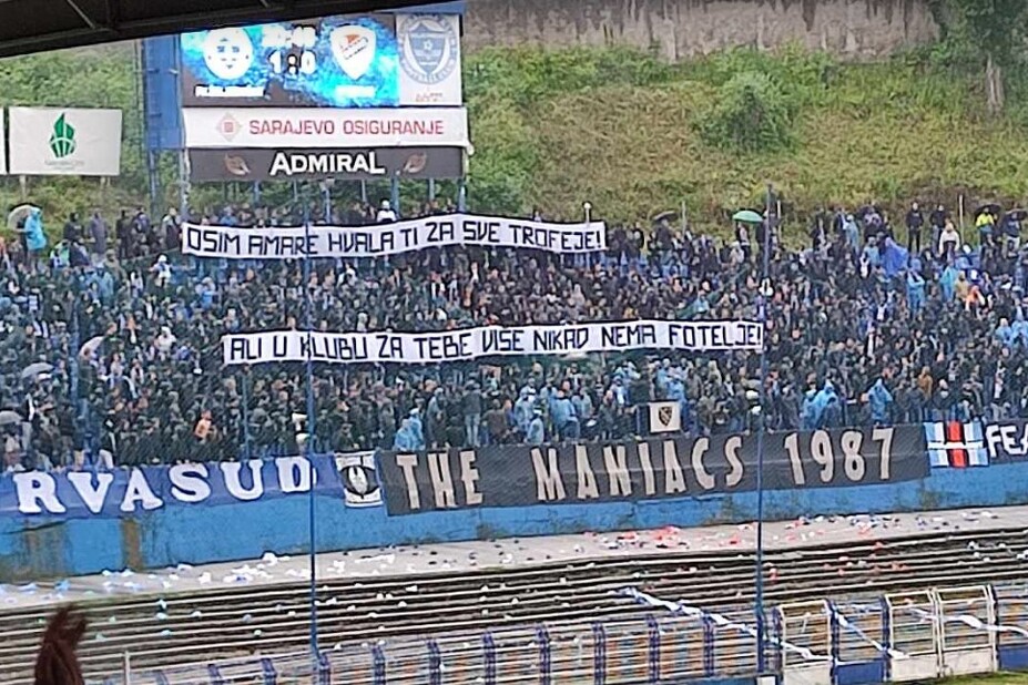 No, u jednom trenutku na južnoj tribini istaknuta je zanimljiva parola u kojoj su Manijaci zauvijek "otpisali" najtrofejnijeg trenera u okvirima BiH, Amara Osima, koji je pet puta doveo Željezničar do titule prvaka BiH.
