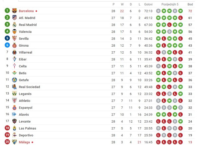 S druge strane, ovim porazom Malaga se dodatno udaljila od mogućnosti da opstane u La Ligi, a nakon 28 odigranih kola oni se nalaze na posljednjoj poziciji sa 13 osvojenih bodova, čak 11 manje od Levantea koji je prvi iznad zone ispadanja.
