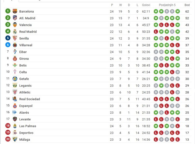 Ovom pobjedom Barcelona je ostala na prvoj poziciji španske La Lige sa 62 osvojena boda, deset više od Atletico Madrida koji svoj meč igra u nedjelju protiv Athletico Bilbaoa.