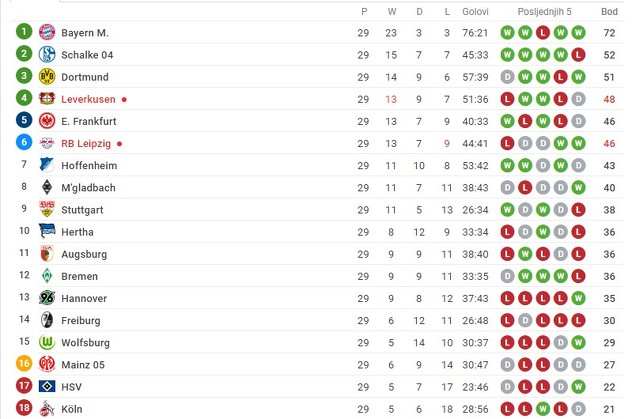 Nakon 29. odigranih kola, Bayer se popeo na četvrtu poziciju koja vodi u Ligu prvaka, dok je Leipzig pao na šesto mjesto sa dva boda manje od Apotekara.
