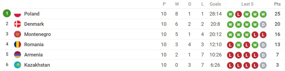 Poljska - Crna Gora 4:2 Danska - Rumunija 1:1 Kazahstan - Armenija 1:1