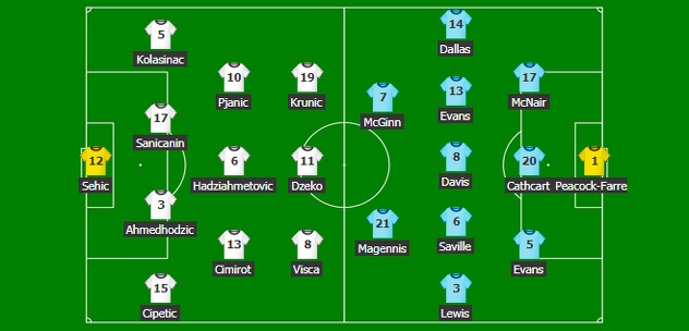Na golu će biti Ibrahim Šehić, a u posljednjoj liniji odbrane ispred njega su Sead Kolašinac, Siniša Saničanin, debitant Anel Ahmedhodžić i Branimir Cipetić. Glavnu ulogu u srcu terena preuzet će povratnik u tim Miralem Pjanić, a društvo u sredini pravit će mu Gojko Cimirot i Amir Hadžiahmetović. Kapiten Edin Džeko predvodit će napad Zmajeva. Podršku s desne strane imat će u Edinu Višći, a s lijeve u Radetu Kruniću.