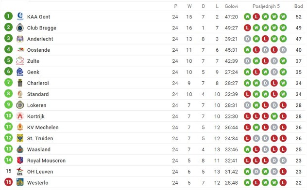U posljednjoj utakmici 24. kola belgijske Jupiler lige Gent je na svom terenu savladao Beveren i na taj način ostao na čelu prvenstva.