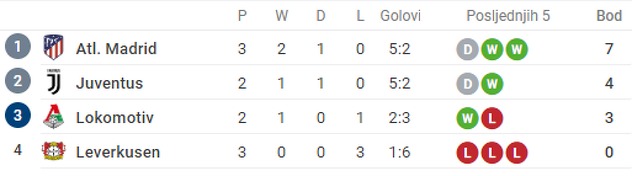 U drugom meču koji je počeo u 18:55 sati, Atletico je golom Morate iz 78. minute savladao Bayer. Ekipa iz Madrida se, barem na kratko, izdvojila na prvom mjestu sa sedam bodova, ispred drugoplasiranog Juventusa koji ima četiri s utakmicom manje. Nju će odigrati večeras od 21:00 sati protiv Lokomotiva. Bayer je bez bodova.
