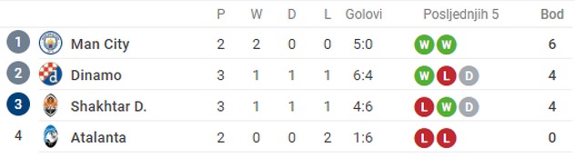 Dinamo i Shakhtar su tako ostali na drugom i trećem mjestu grupe sa po četiri boda, dok je Manchester City prvi sa šest osvojenih bodova. Večeras se od 21:00 sat sastaju Manchester City i Atalanta.