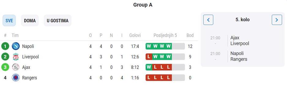 U grupi A se sastaju Ajax i Liverpool, te Napoli i Rangersi. Napoli je već osigurao prolaz u osminu finala, a večeras im se može pridružiti Liverpool ukoliko osvoji barem bod u Amsterdamu. Ajax bi porazom doveo u pitanje i plasman u Evropsku ligu za koji bi se borio u posljednjem kolu s Rangersima.