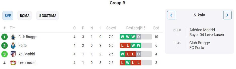 Club Brugge je već prošao dalje iz grupe B, a preostale tri ekipe još uvijek imaju šanse proći u osminu finala. Porto je u najboljoj poziciji i u slučaju trijumfa u Belgiji će doći na korak do plasmana među 16 najboljih ekipa u Evropi. Portugalci bi mogli već i u ovom kolu proći u osminu finala ukoliko slave, a Atletico i Bayer remiziraju.