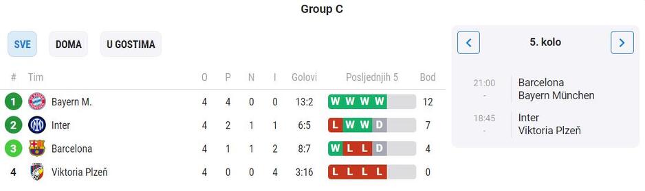 Bayern je suvereno sa četiri pobjede na vrhu grupe C i prošao je dalje, a večeras bi im se trebao priključiti Inter. Edin Džeko i saigrači na svom terenu dočekuju Plzen i pobjedom idu u osminu finala. No, čak i u slučaju poraza mogu proći u nokaut fazu ukoliko Barcelona ne pobijedi Bayern kod kuće. Barca može čak ostati i bez Evropske lige ukoliko izgubi u posljednje dvije utakmice.