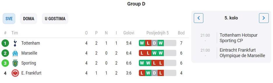 U grupi D sve je otvoreno i sve četiri ekipe mogu proći dalje. Tottenham je na vrhu i dočekuje Sporting, a pobjedom bi napravio veliki korak ka plasmanu u osminu finala. U drugom susretu Eintracht dočekuje Marseille za koji igra Sead Kolašinac. Ukoliko Tottenham i Marseille slave, obje ekipe prolaze u osminu finala.