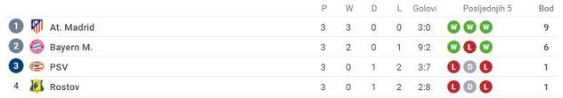 Atletico Madrid je u gostima kod Rostova slavio sa 1:0, a jedini gol na utakmici postigao je Carrasco u 62. minuti čime je svoj tim ostavio na prvom mjestu tabele sa maksimalnim učinkom od devet bodova.