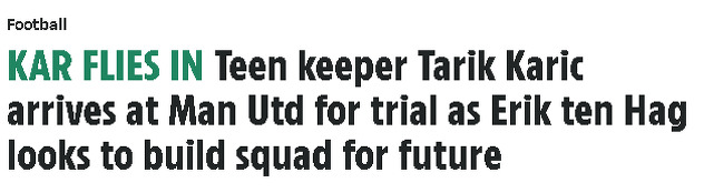 "Golman tinejdžer Tarik Karić stigao je na probu u Manchester United dok Erik ten Haag želi izgraditi ekipu za budućnost", stoji u naslovu šestog najčitanijeg britanskog medija.