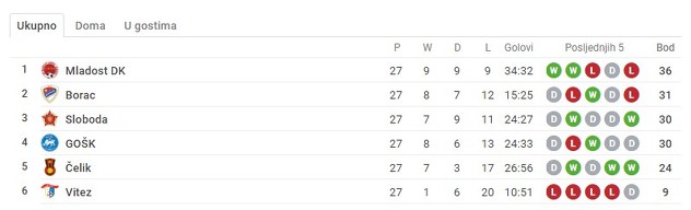 Nakon 27 odigranih utakmica, GOŠK se nalazi na desetoj poziciji sa 30 osvojenih bodova, šest više od Čelika, dok se Vitez porazom od Zeničana u prošlom kolu oprostio od Premijer lige.