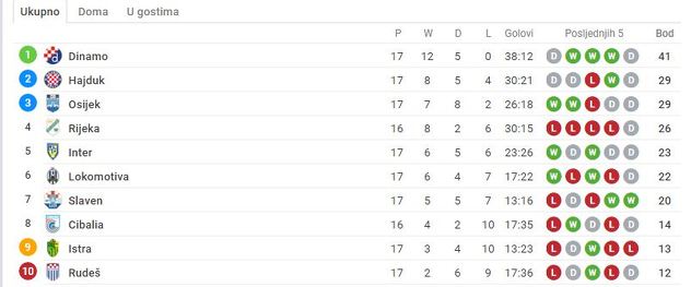 Nakon 17 odigranih utakmica Dinamo je prvi sa 12 bodova više od Hajduka i Osijeka koji imaju po 29 bodova.