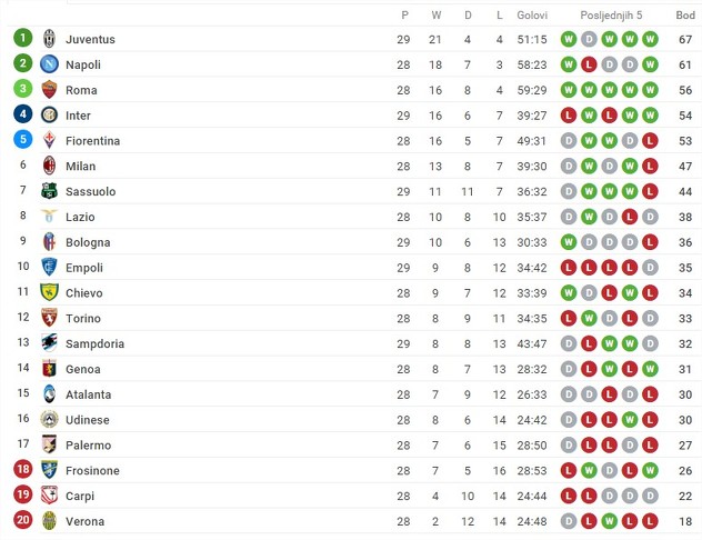 Empoli je ranije kao domaćin podijelio bodove sa Sampdorijom (1:1). Quagliarella je doveo goste u vodstvo u 42. minuti, a konačnih 1:1 postavio je Laurini u 82. minuti.