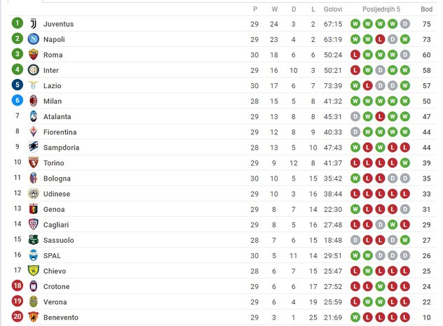 U posljednjem meču, Genova je na domaćem terenu s igračem više ispustila prednost protiv SPAL-a, a konačni rezultat glasio je 1:1. Domaći su u vodstvo stili u 30. minuti kada Lapadula pogađa s bijele tačke, a iako su u 29. ostali bez Vicarija, gostujući igrači u 60. minuti preko Lazzarija stižu do jednog boda.