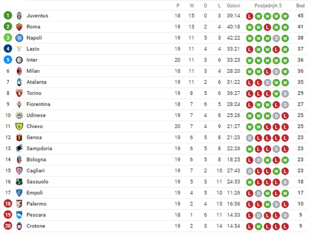 Ranije je Bologna golom Džemailija (51') pobijedila Crotone u gostima.