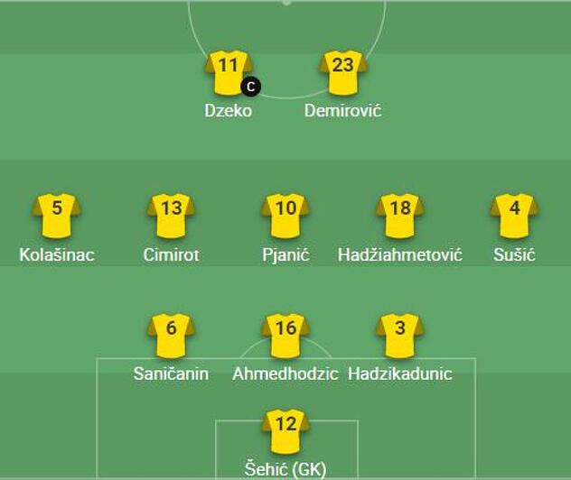 Po bokovima će biti Mateo Sušić i Sead Kolašinac, a u veznom redu Gojko Cimirot, Amir Hadžiahmetović i Miralem Pjanić, dok će u napadu biti kapiten Edin Džeko i mladi Ermedin Demirović.