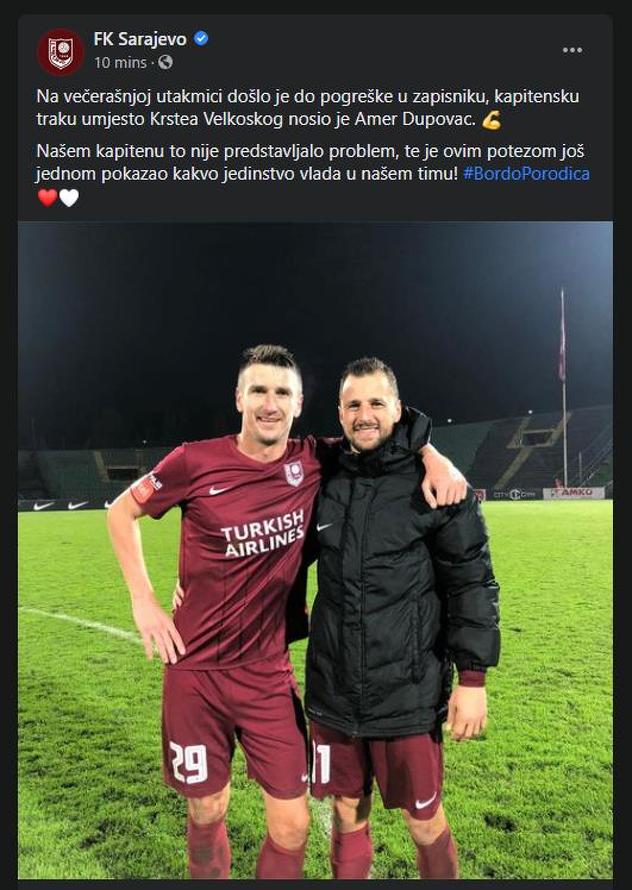 "Na večerašnjoj utakmici došlo je do pogreške u zapisniku, kapitensku traku umjesto Krste Velkoskog nosio je Amer Dupovac. Našem kapitenu to nije predstavljalo problem, te je ovim potezom još jednom pokazao kakvo jedinstvo vlada u našem timu!", poručili su iz FK Sarajevo.