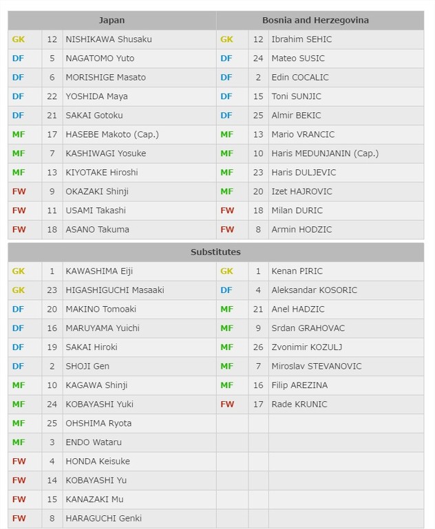 Japan: Nishikawa - Nagatomo, Morishige, Yoshida, Sakai - Hasebe, Kashiwagi, Kiyotake - Okazaki, Usami.